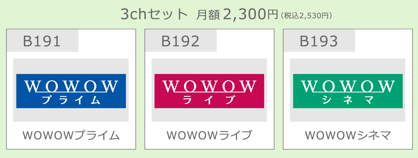 | BS191 BS192 BS193 | WOWOWシネマ|WOWOWライブ|WOWOWプライム | 3chセット 2,530円/月 | ||